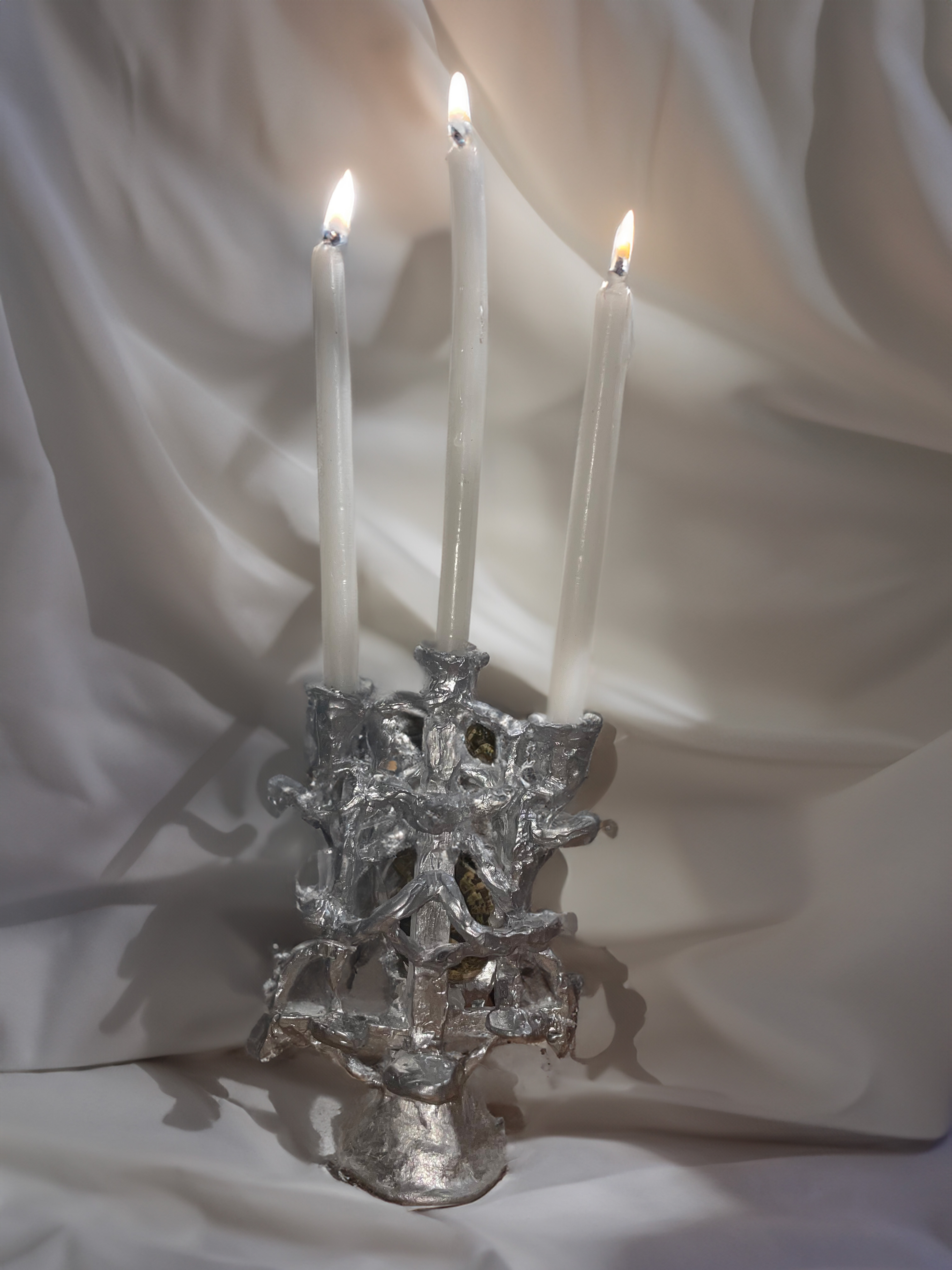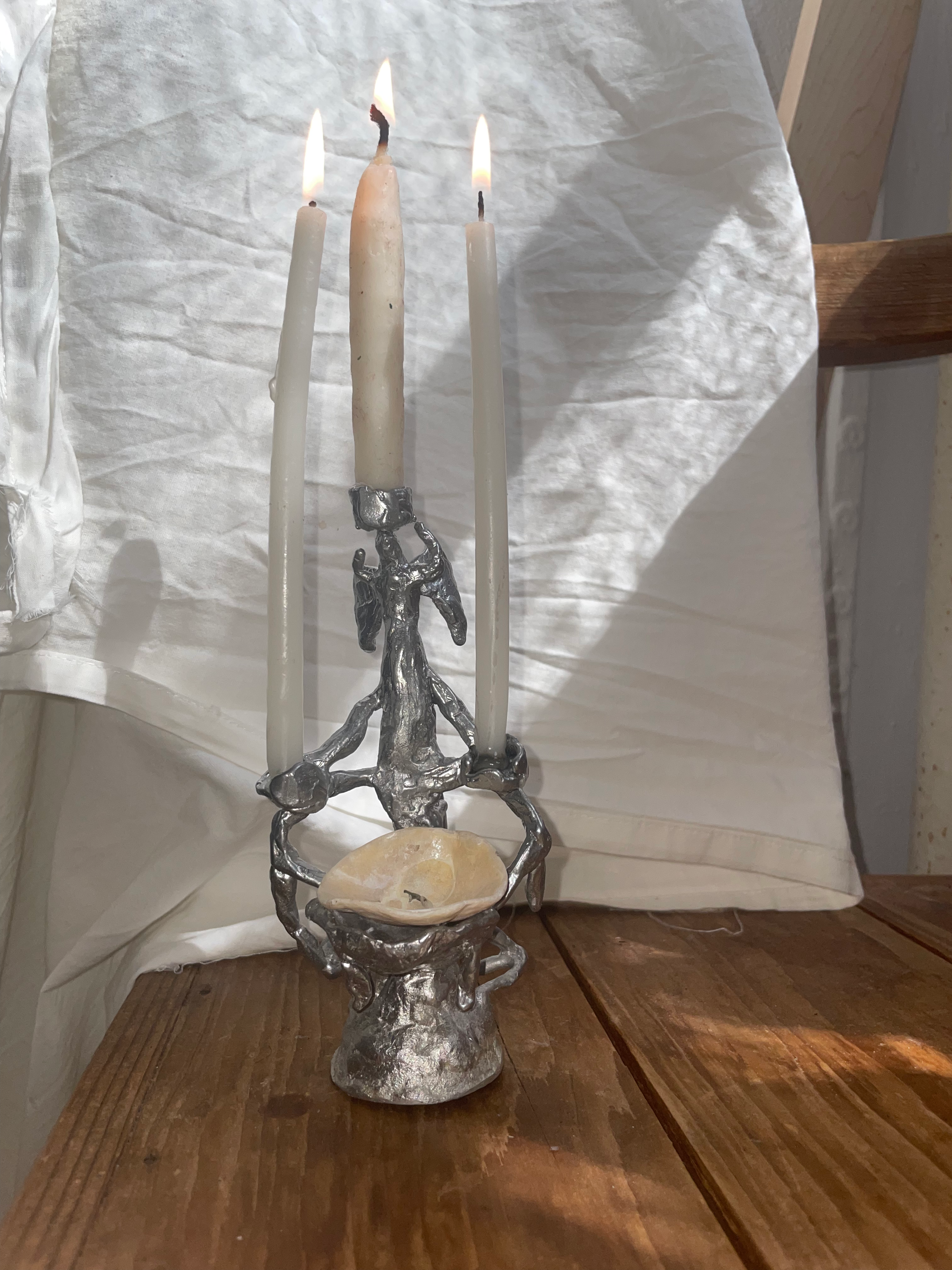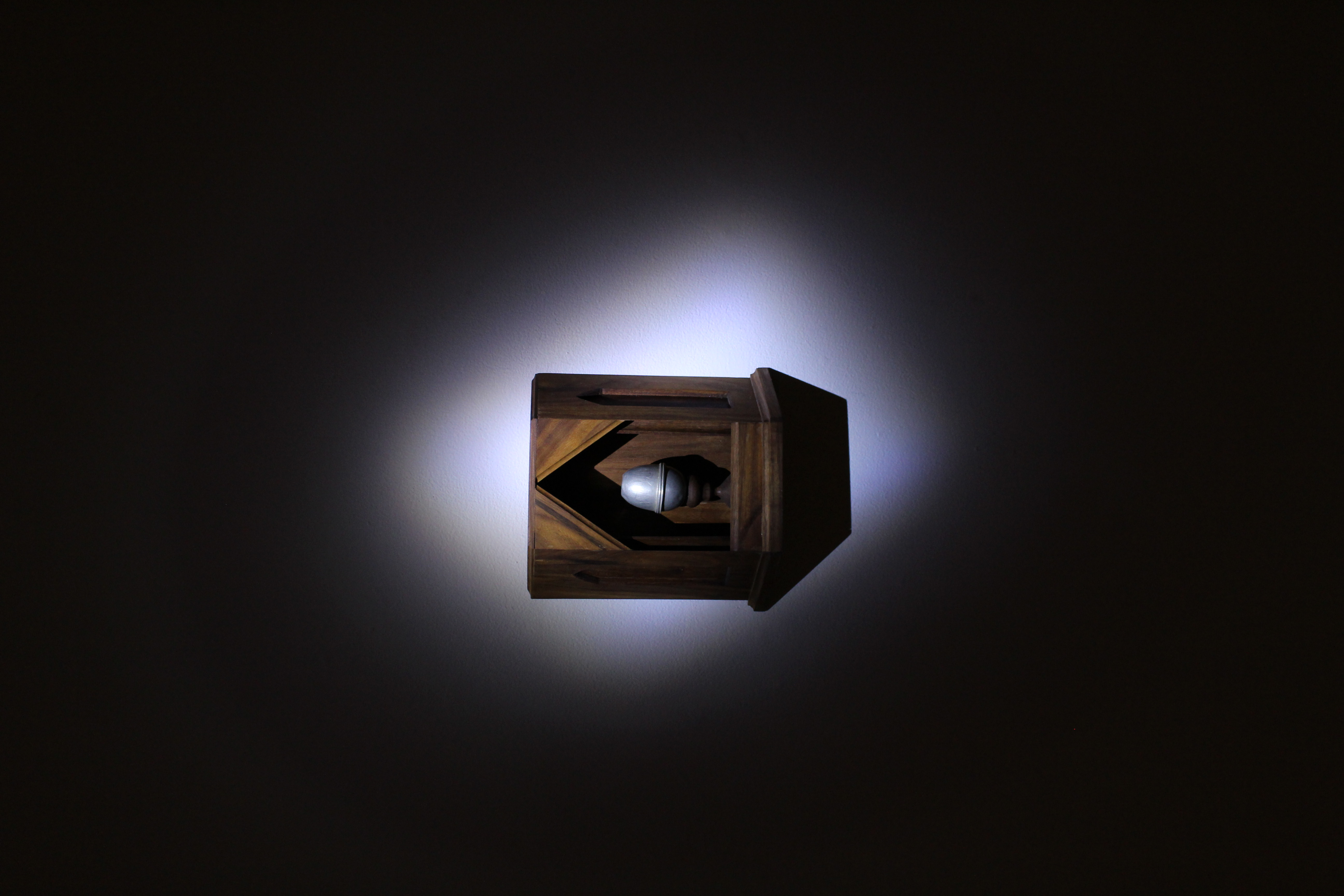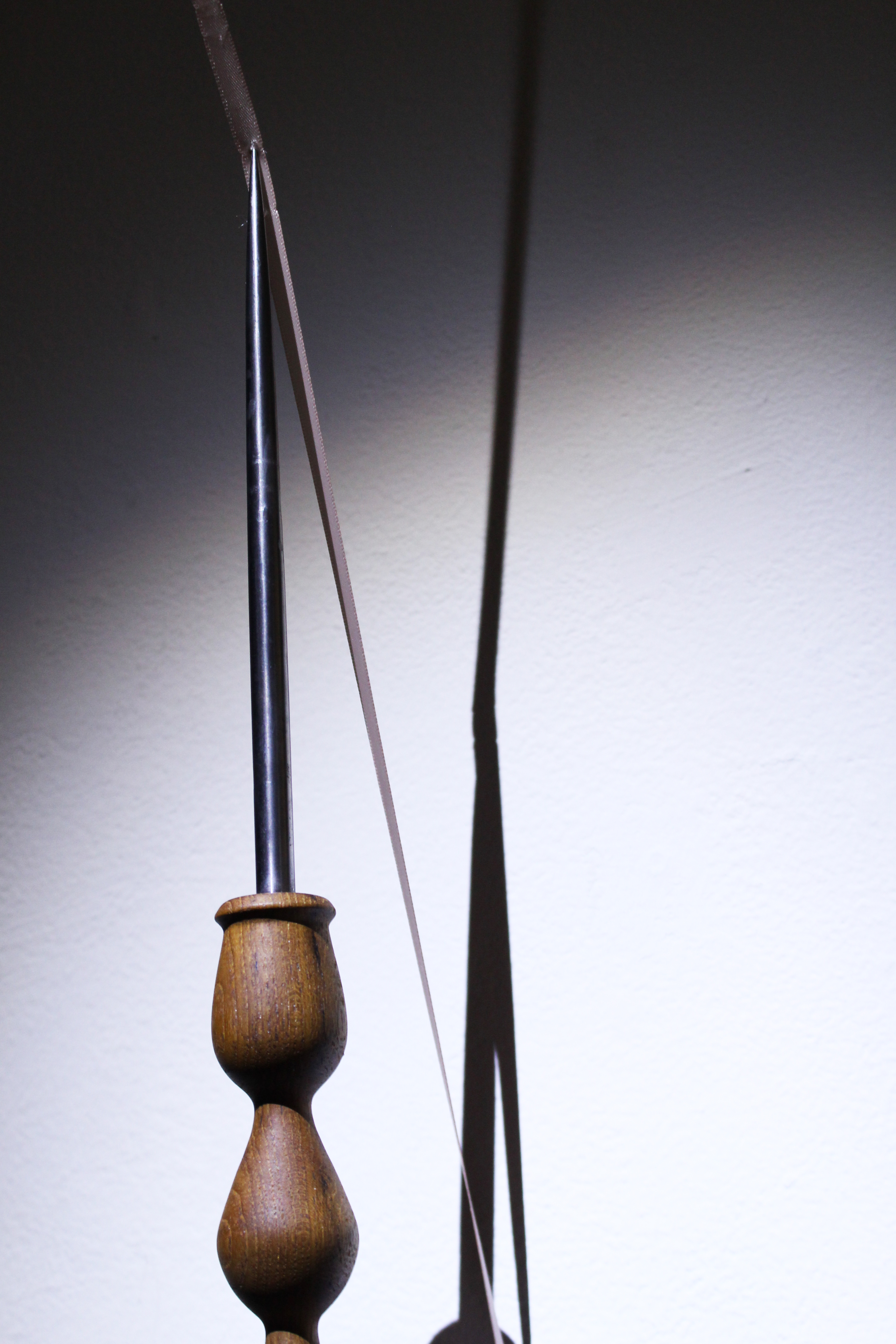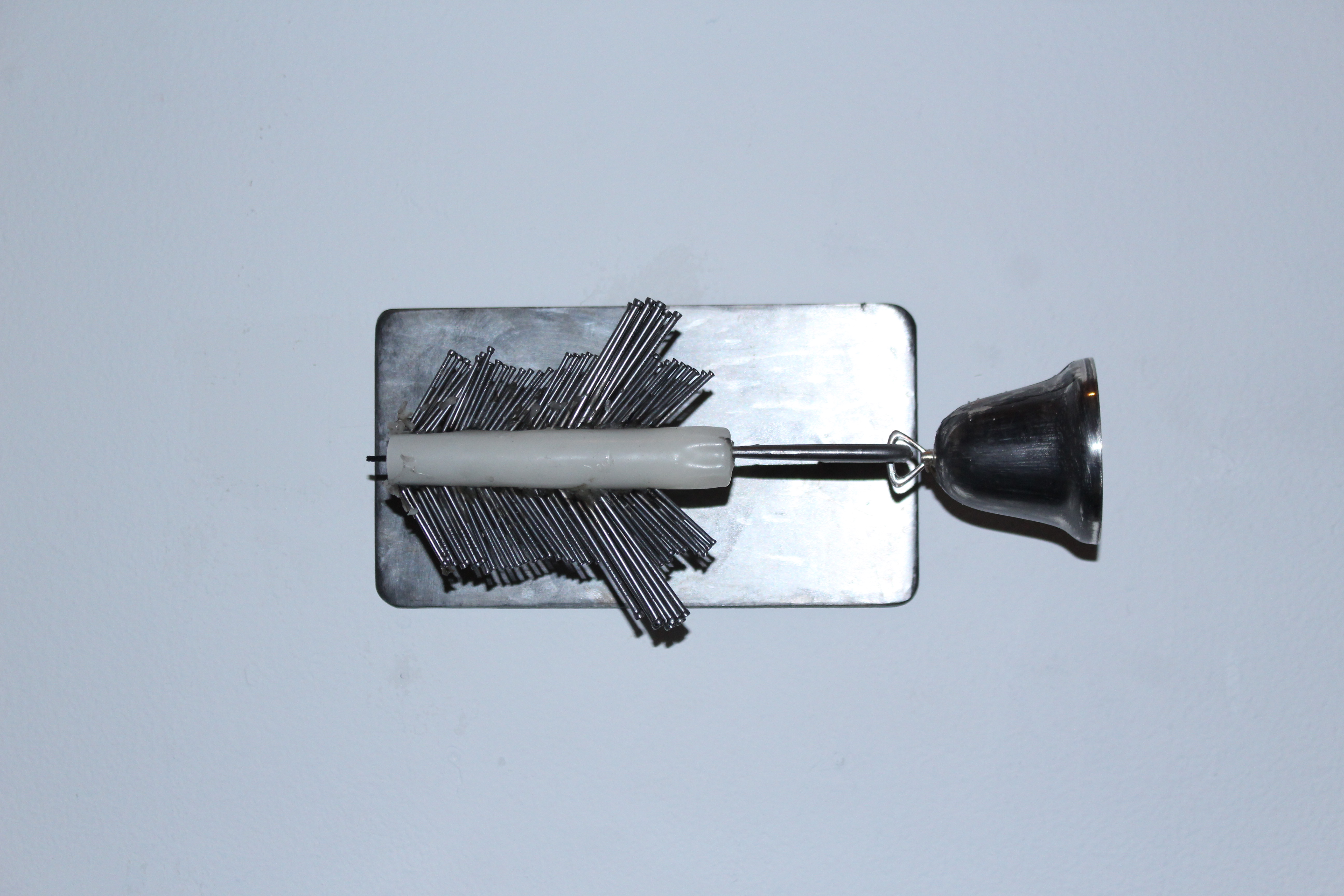 walnut wood, wax, steel, aluminum, nails, contact microphones, amp, delay pedalThe Candle Metronome is a self-playing and durational musical instrument. As the candle burns, the nails fall into the different sized bowls, which resonates the contact microphones and amplifies the sounds with a delay.