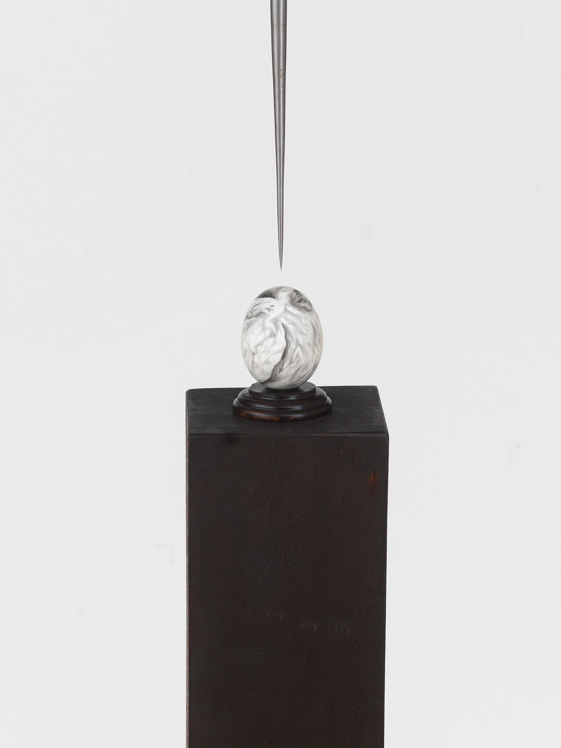 chicken egg, graphite, steel, maple wood, satin ribbon, on artist’s own pedestal