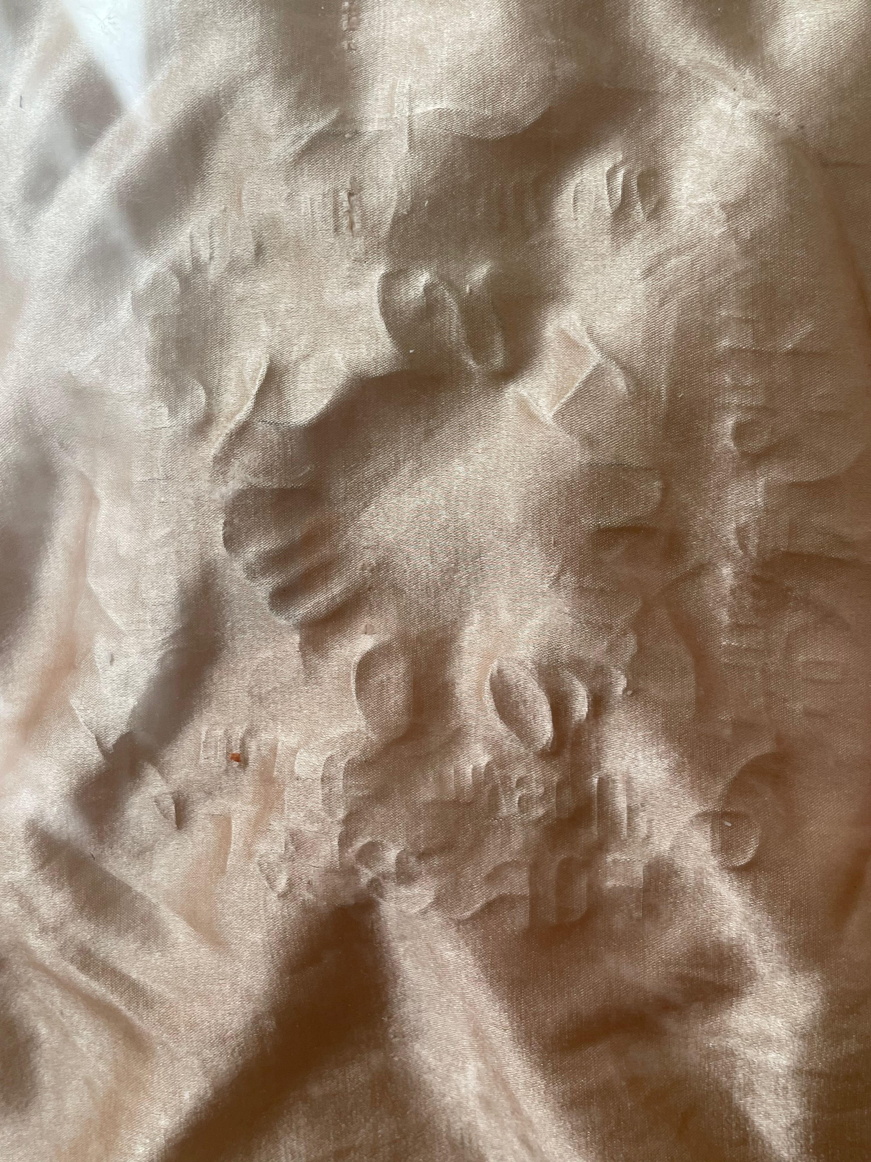 satin ribbon that spans the length of a room, satin cloth, replica ceramic dove egg, walnut wood, teak wood, steel, oak wood